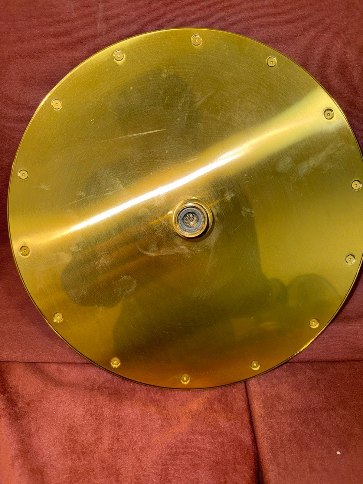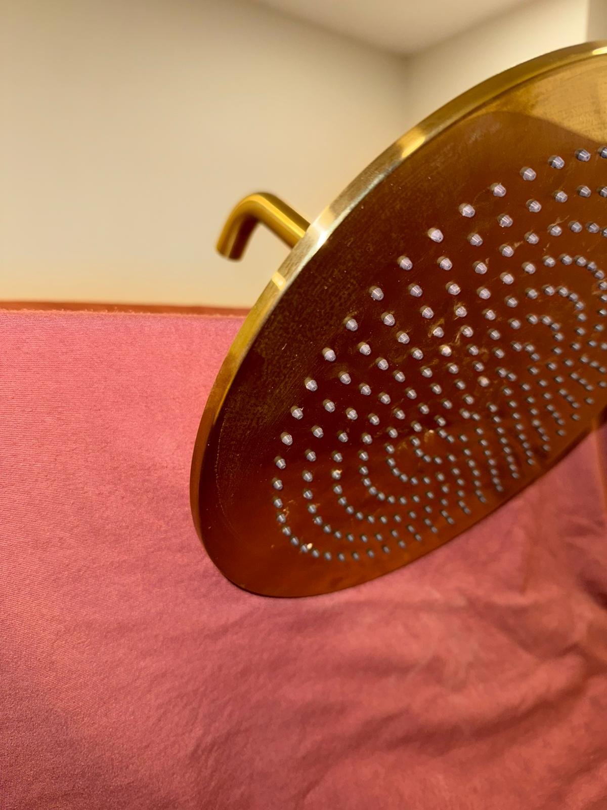 Alcachofa de ducha con acabado dorado y diseño circular nueva, de la marca Porcelanosa que aporta un estilo elegante y moderno.
