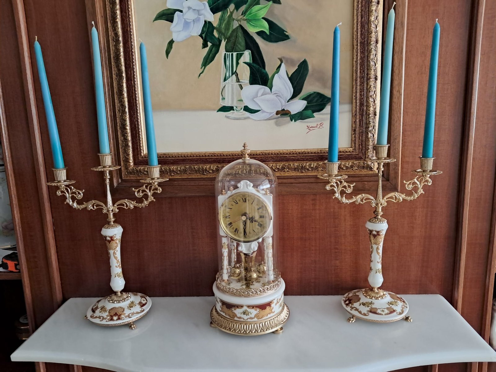 Set de decoración clásica compuesto por dos candelabros con ornamentación barroca y un reloj a juego del mismo estilo. Perfecto para aportar un toque clásico y barroco a sus estancias.