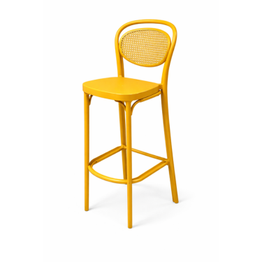 Taburete alto metálico en color amarillo con respaldo de rejilla.