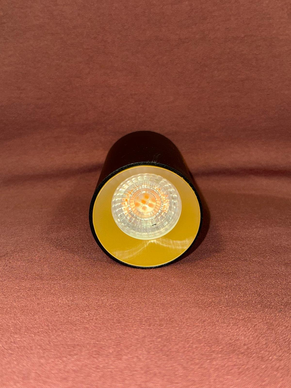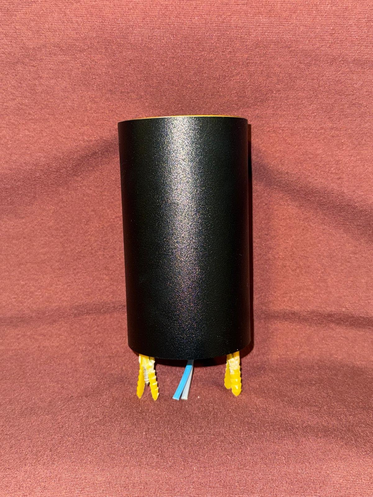 Aplique de diseño cilíndrico nuevo de la marca ALVE diseñado a medida para este hotel, con acabado exterior oscuro y detalle interior en tono dorado, que aporta un contraste elegante y actual. Su formato compacto lo hace discreto y decorativo.