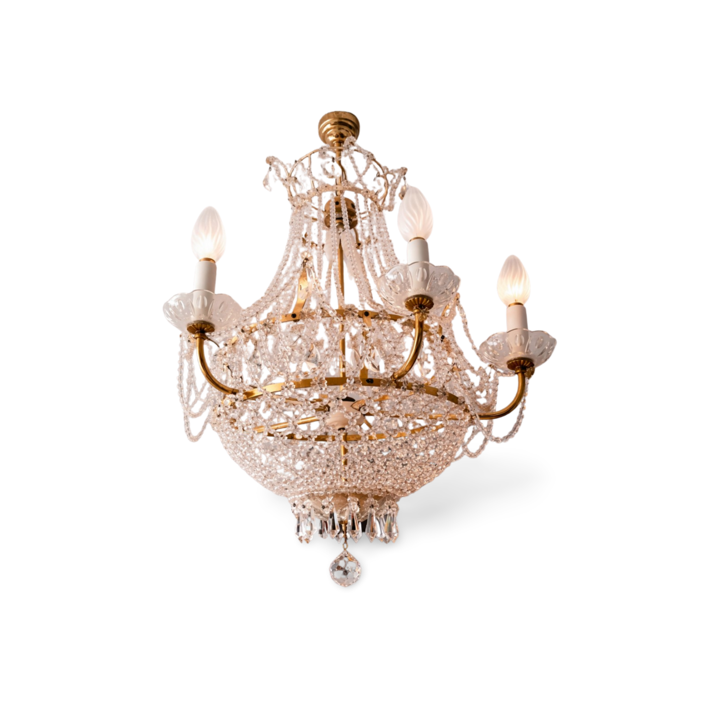 Lámpara de araña clásica colgante, alargada, con cuatro luces, en perfecto estado. Fabricada con estructura dorada y cristales, aporta un toque elegante y sofisticado a cualquier estancia.