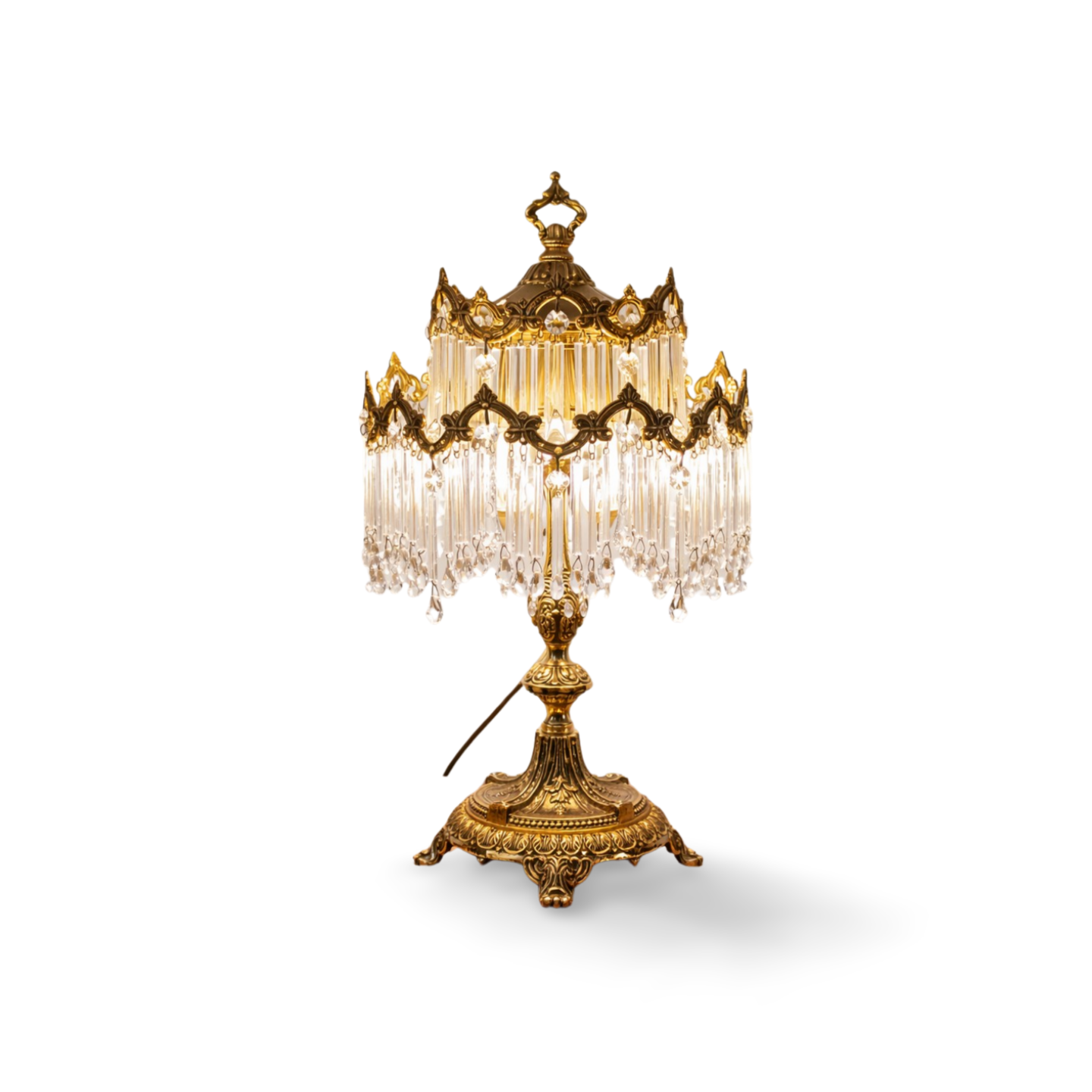 Lámparas de mesilla de noche estilo araña, en dorado y cristal, de diseño clásico y tamaño ideal para cualquier dormitorio, aportando elegancia y luminosidad.