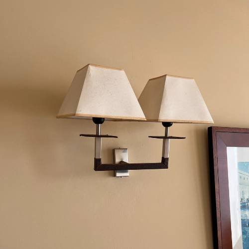 Aplique de pared doble con estructura metálica y pantallas en tela beige. Diseño elegante y funcional, perfecto para salones, dormitorios u hoteles.