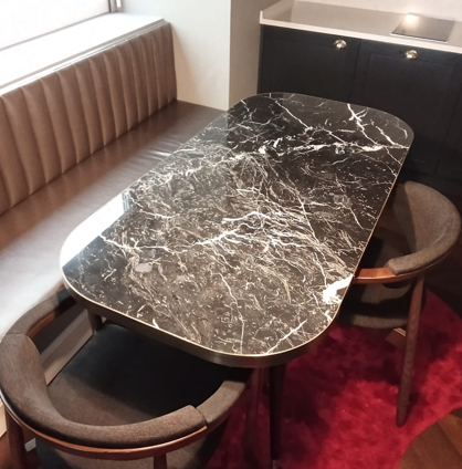 Mesa de comedor en muy buen estado, con tapa de mármol oscuro y diseño moderno. Elegante, resistente y perfecta para cualquier espacio.