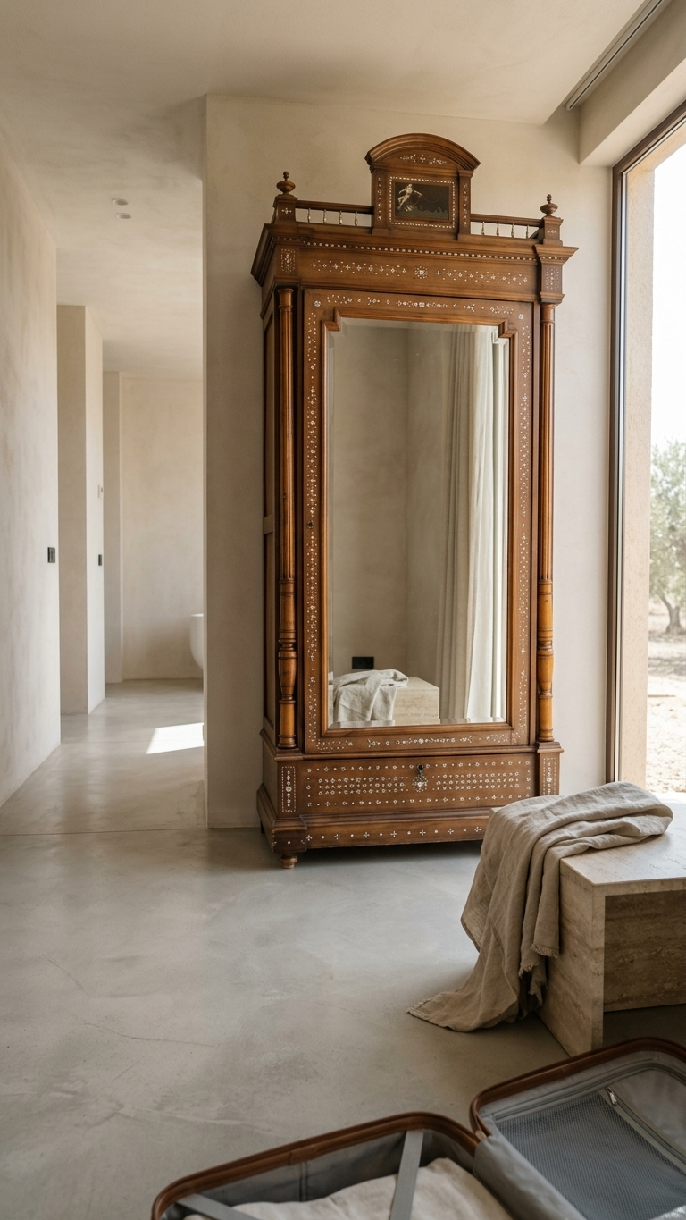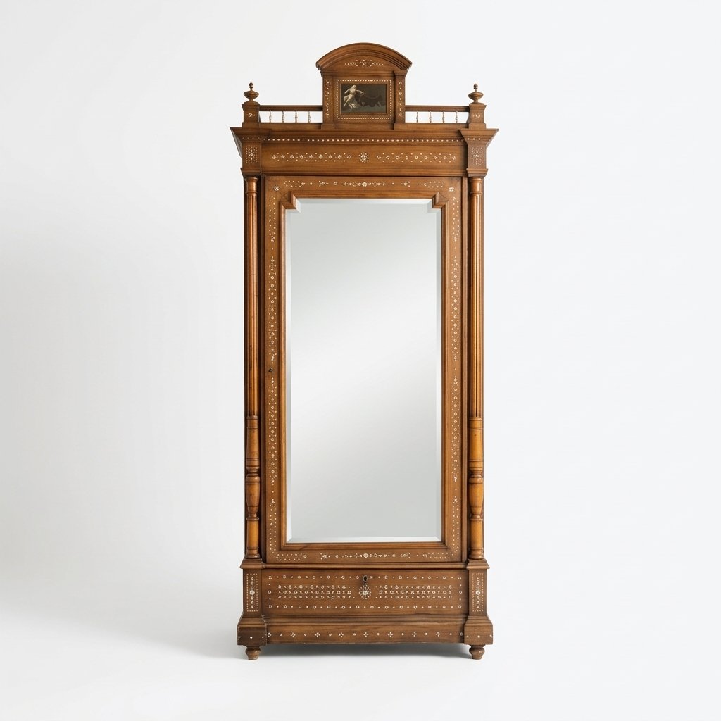 Armario de madera con espejo, tallado y decorado con la técnica de marquetería, incorporando delicados detalles en blanco. Una pieza elegante y artística que combina funcionalidad y estilo, aportando un toque distinguido y refinado al dormitorio.