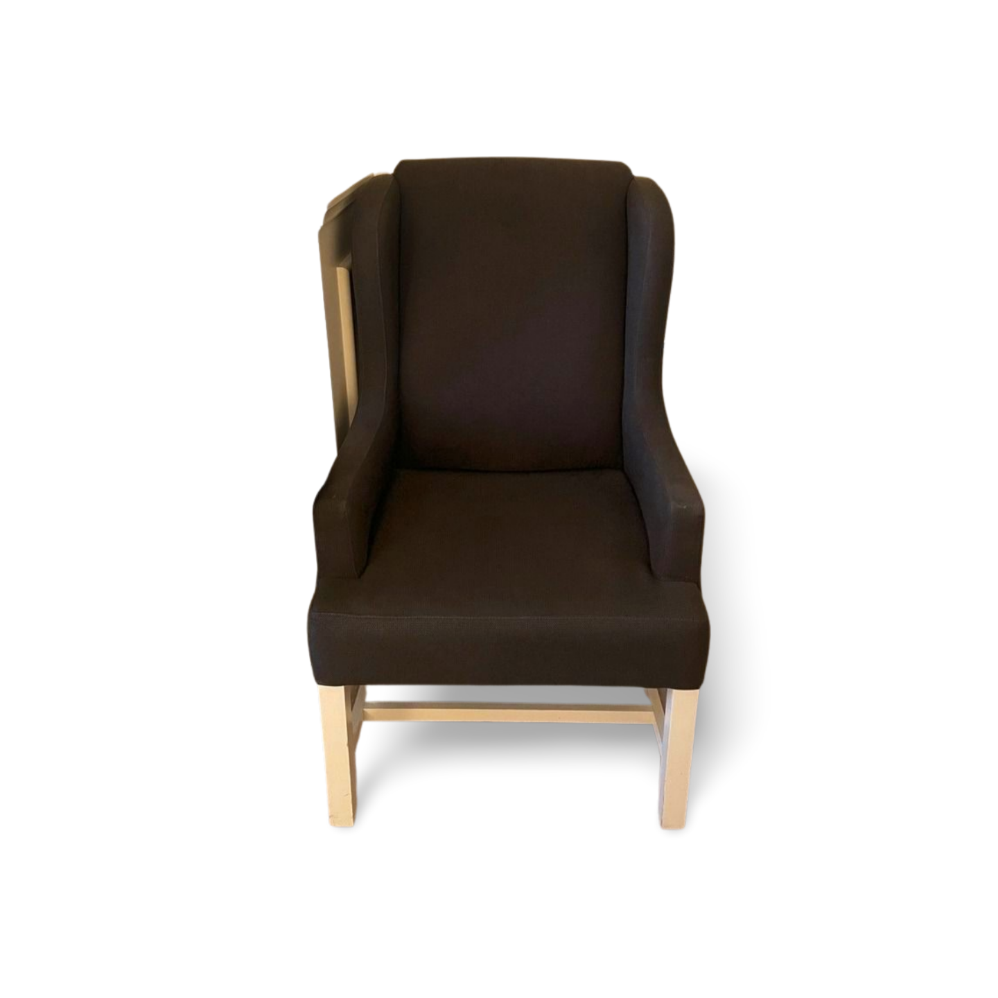 Butaca de salón con base de madera blanca.