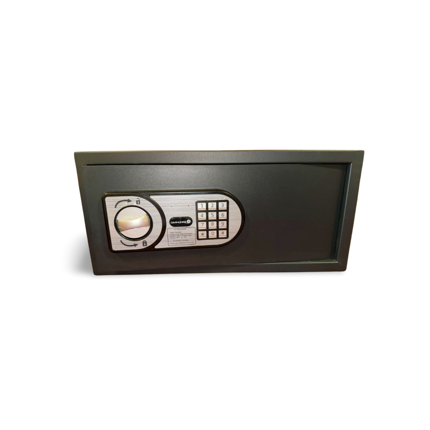 Caja fuerte con diseño compacto y acabado oscuro nueva, equipada con sistema de cierre mediante teclado y rueda giratoria.