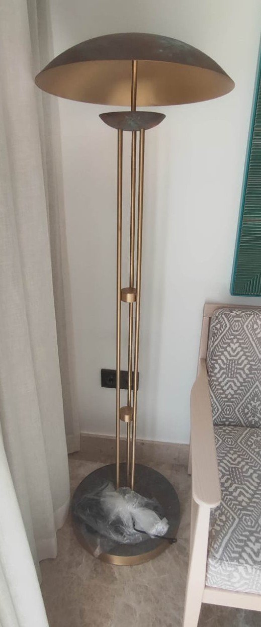 Lámpara de pie de diseño inspirado en los años 20, con acabado dorado y base efecto mármol. Una pieza elegante y decorativa para aportar estilo y sofisticación al espacio.