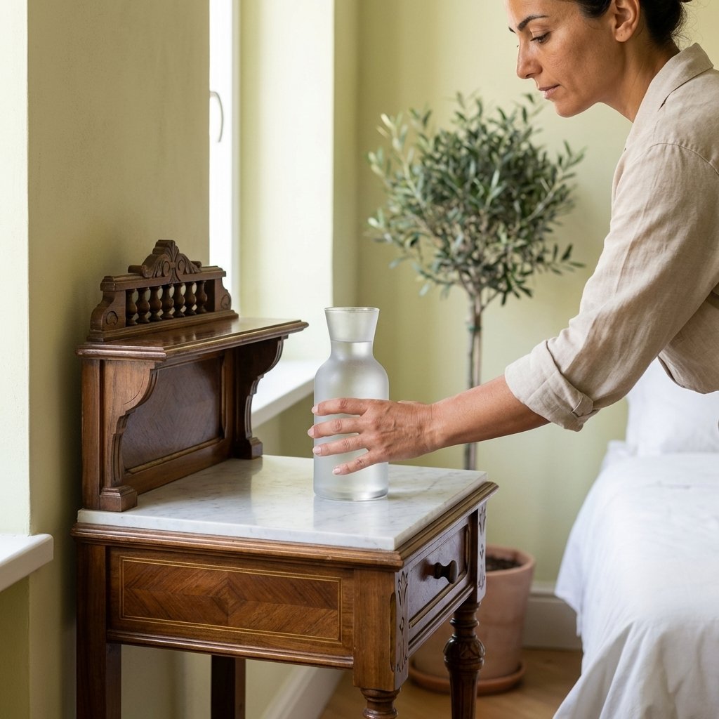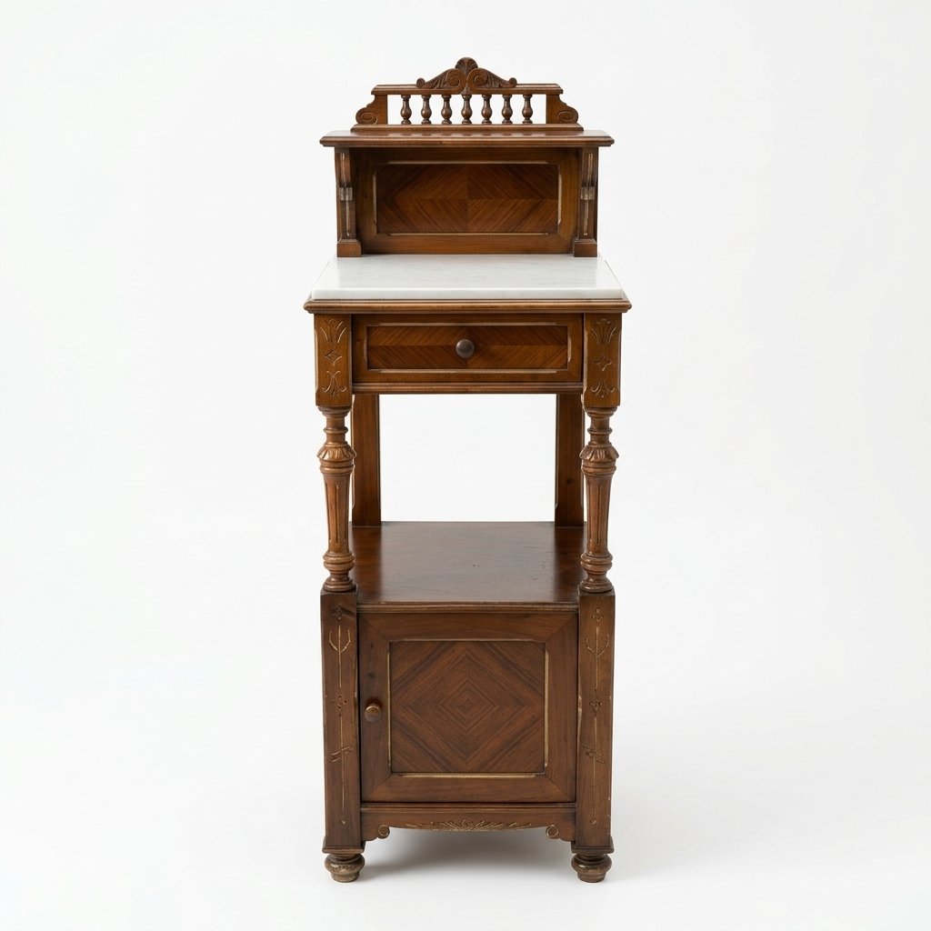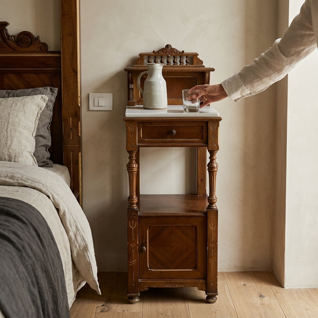 Mesilla de noche de madera de estilo clásico con encimera clara, ideal para aportar elegancia y funcionalidad al dormitorio.
