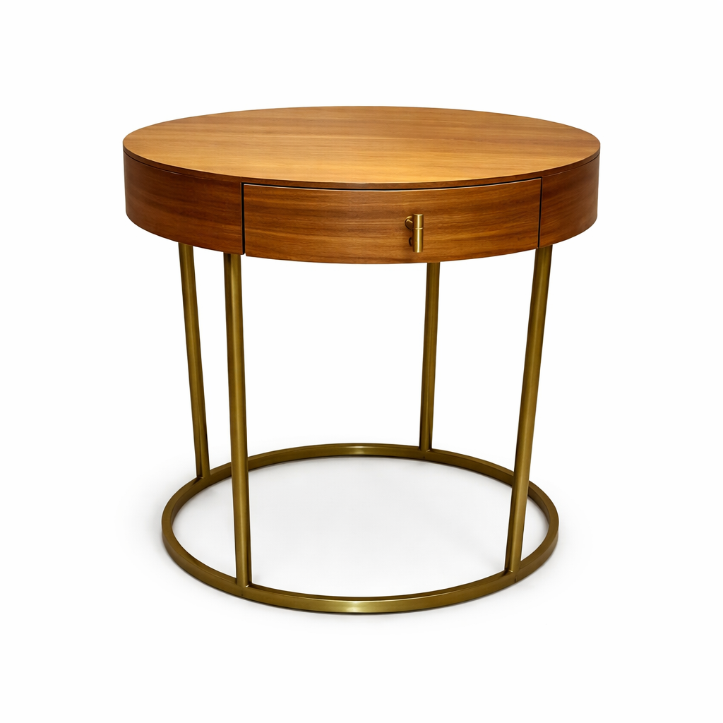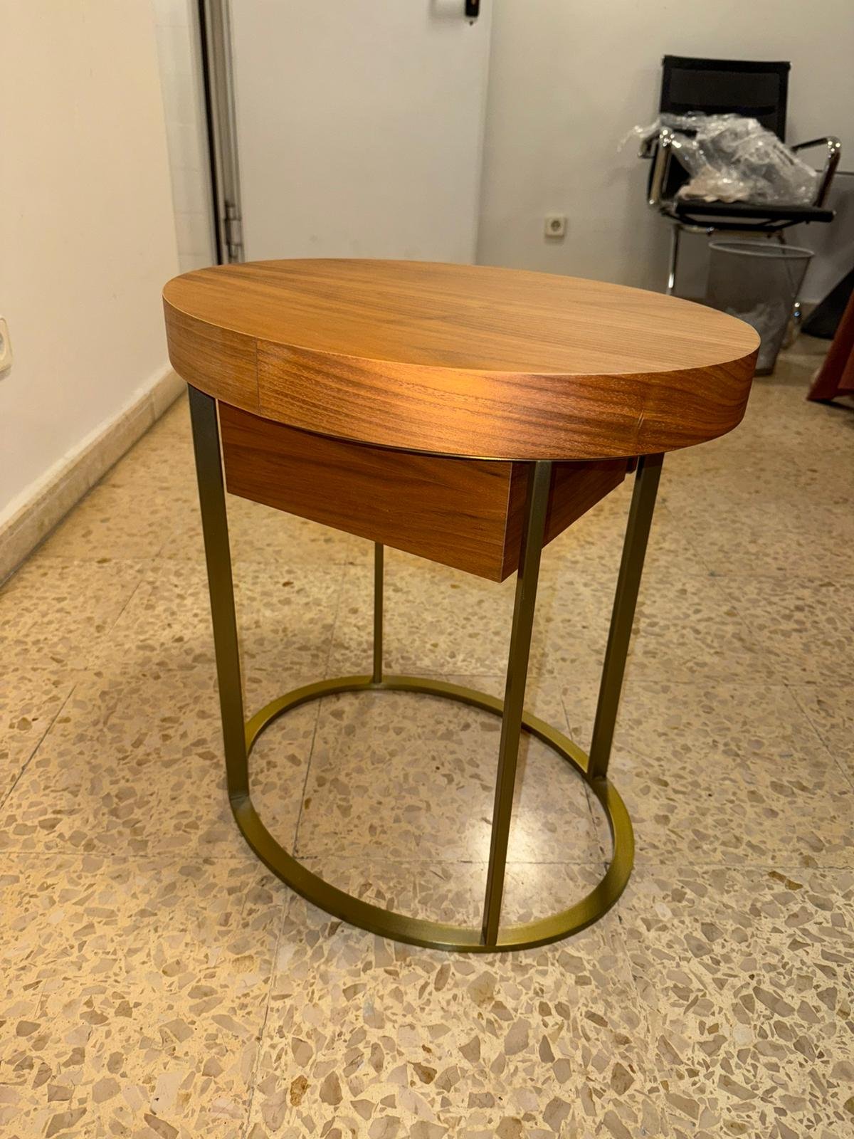Mesita de noche nueva con sobre circular en acabado madera y estructura metálica en tono dorado, que aporta un diseño ligero y elegante.