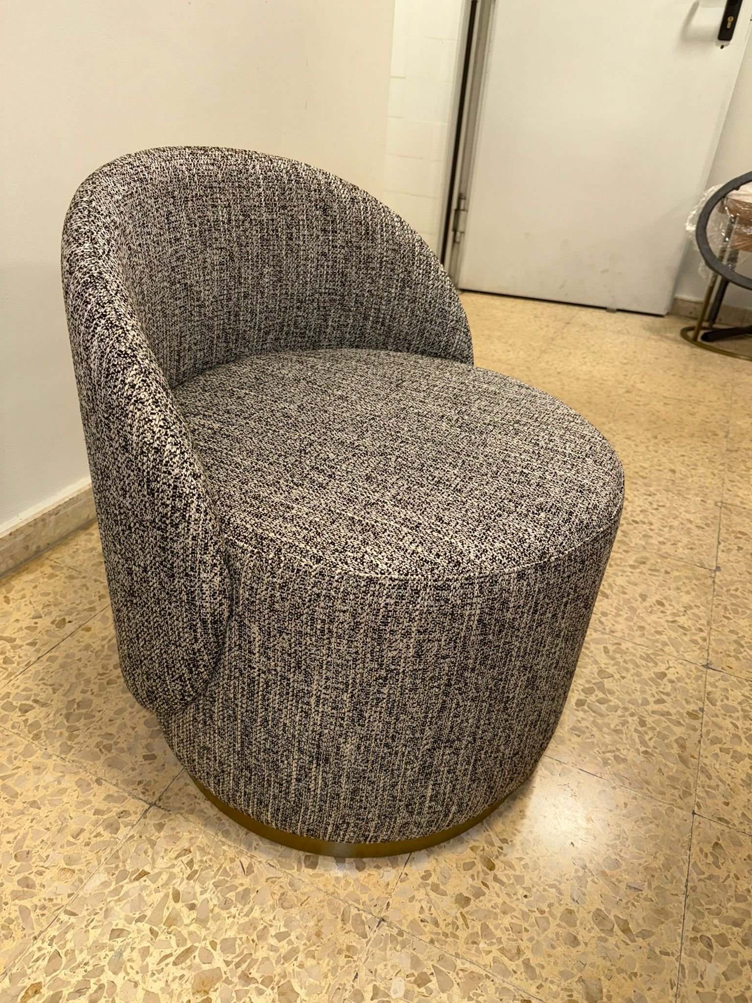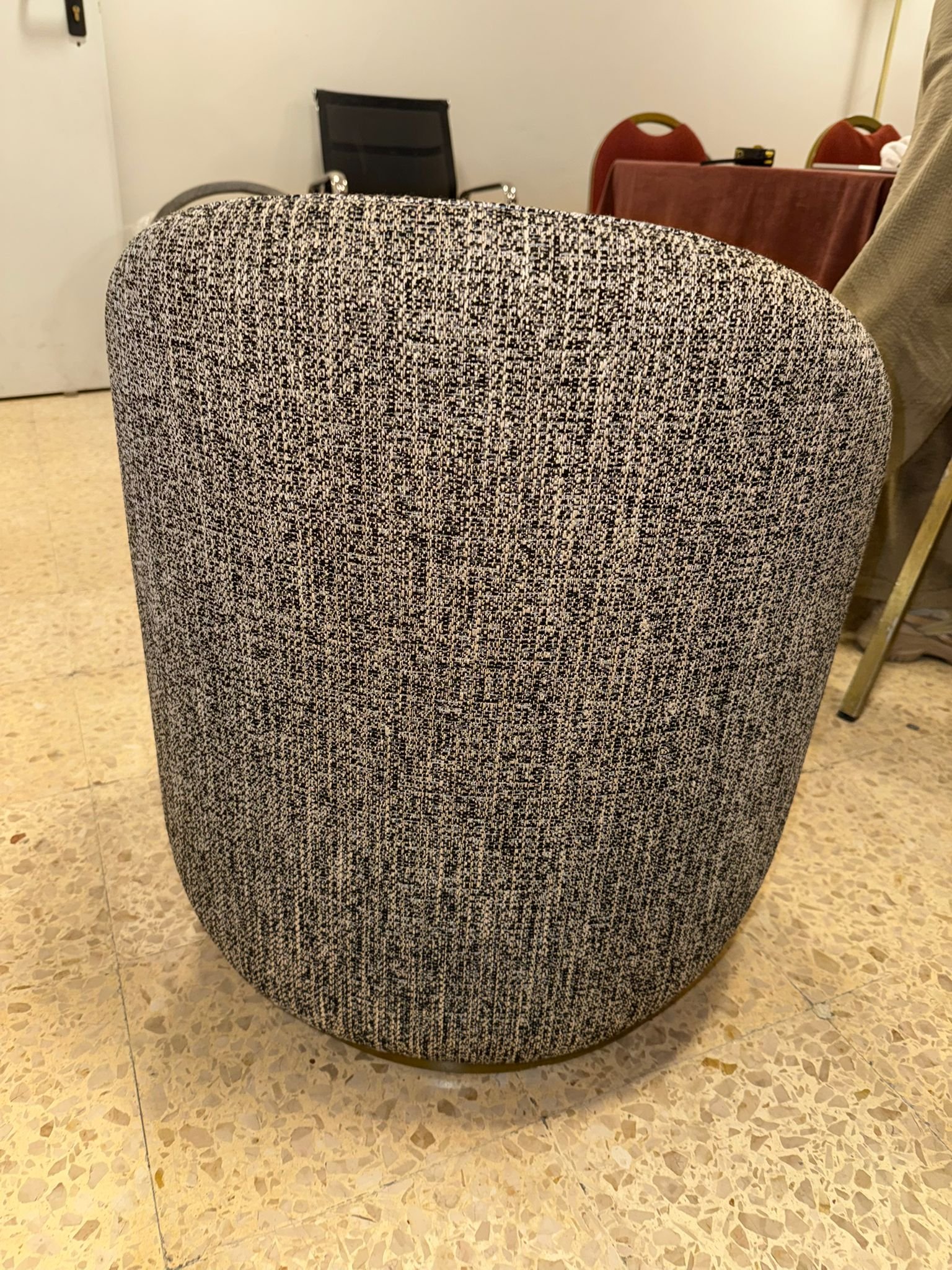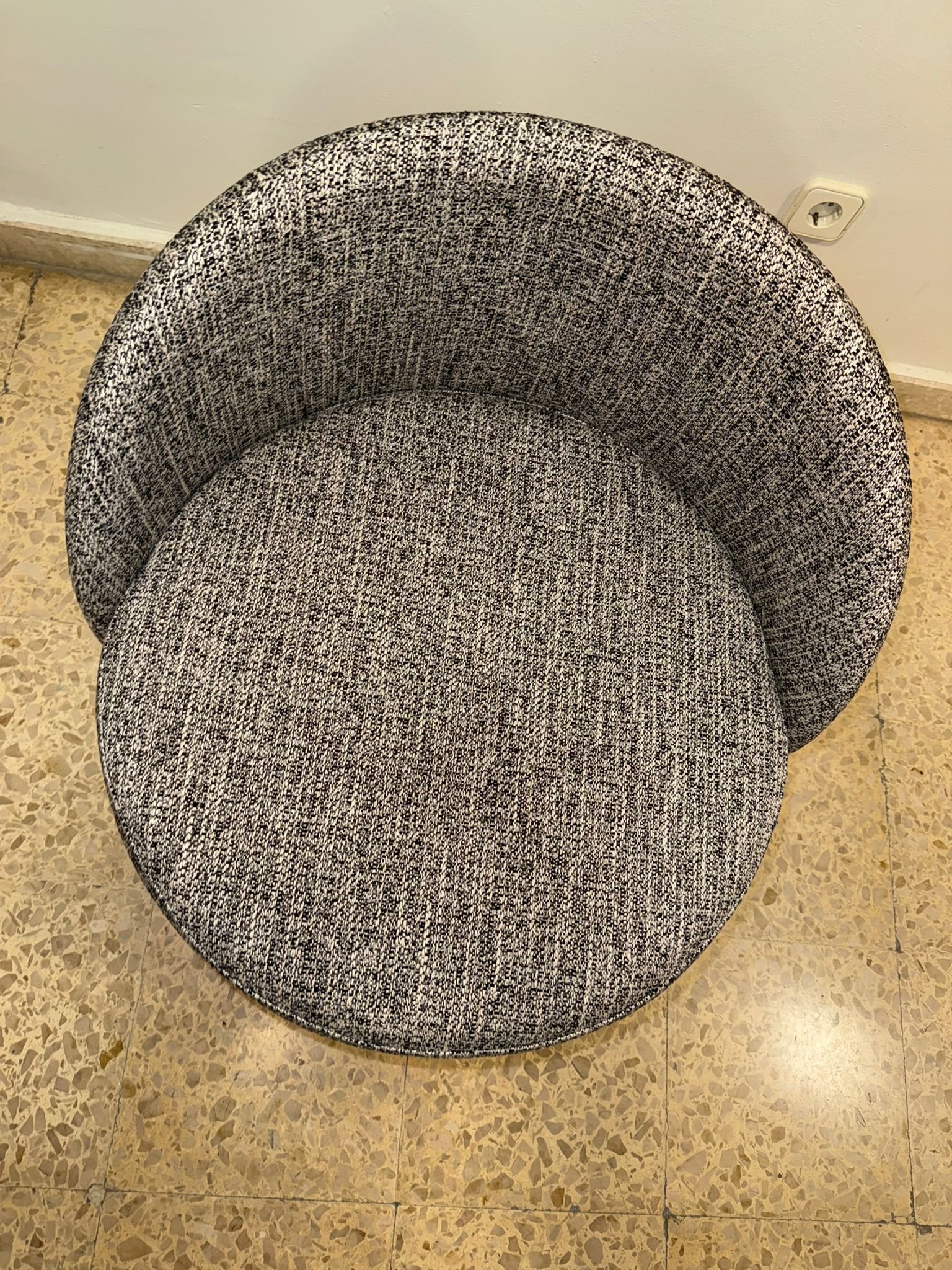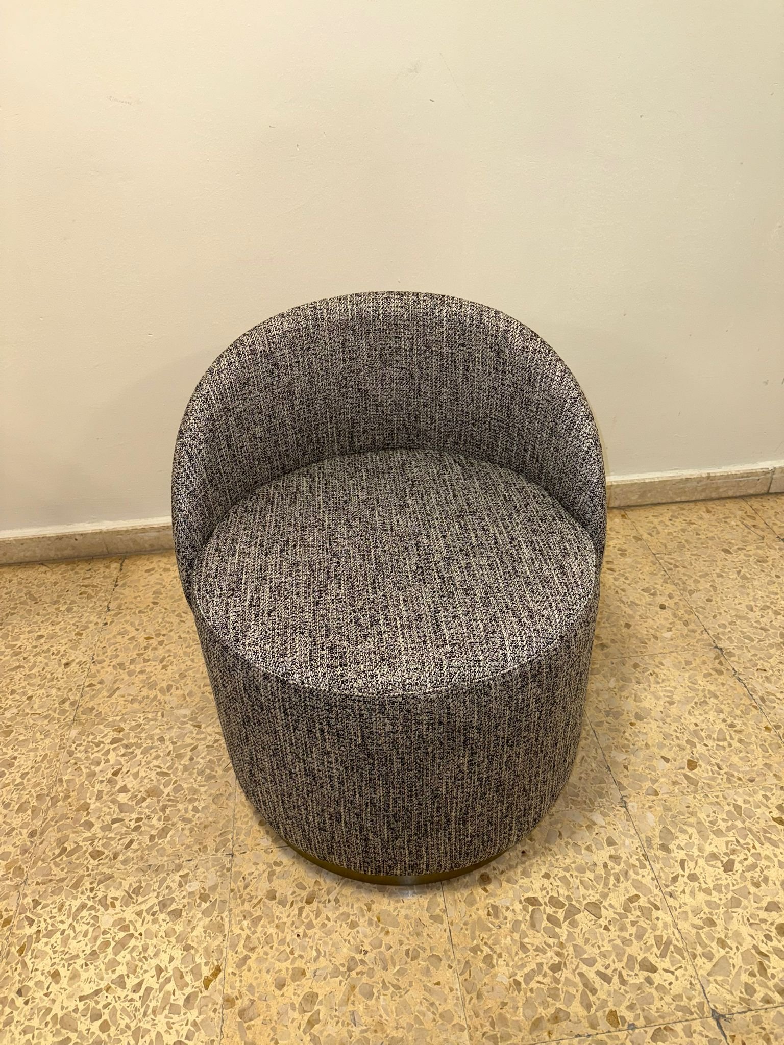 Puff tapizado nuevo en tejido gris con forma redondeada y diseño compacto, que ofrece un asiento cómodo y acogedor. Su estilo sencillo lo hace fácil de integrar en distintos espacios.