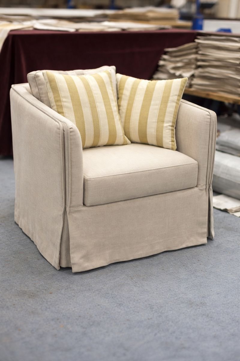 Sillón con estructura acolchada y tapizado en tono claro.