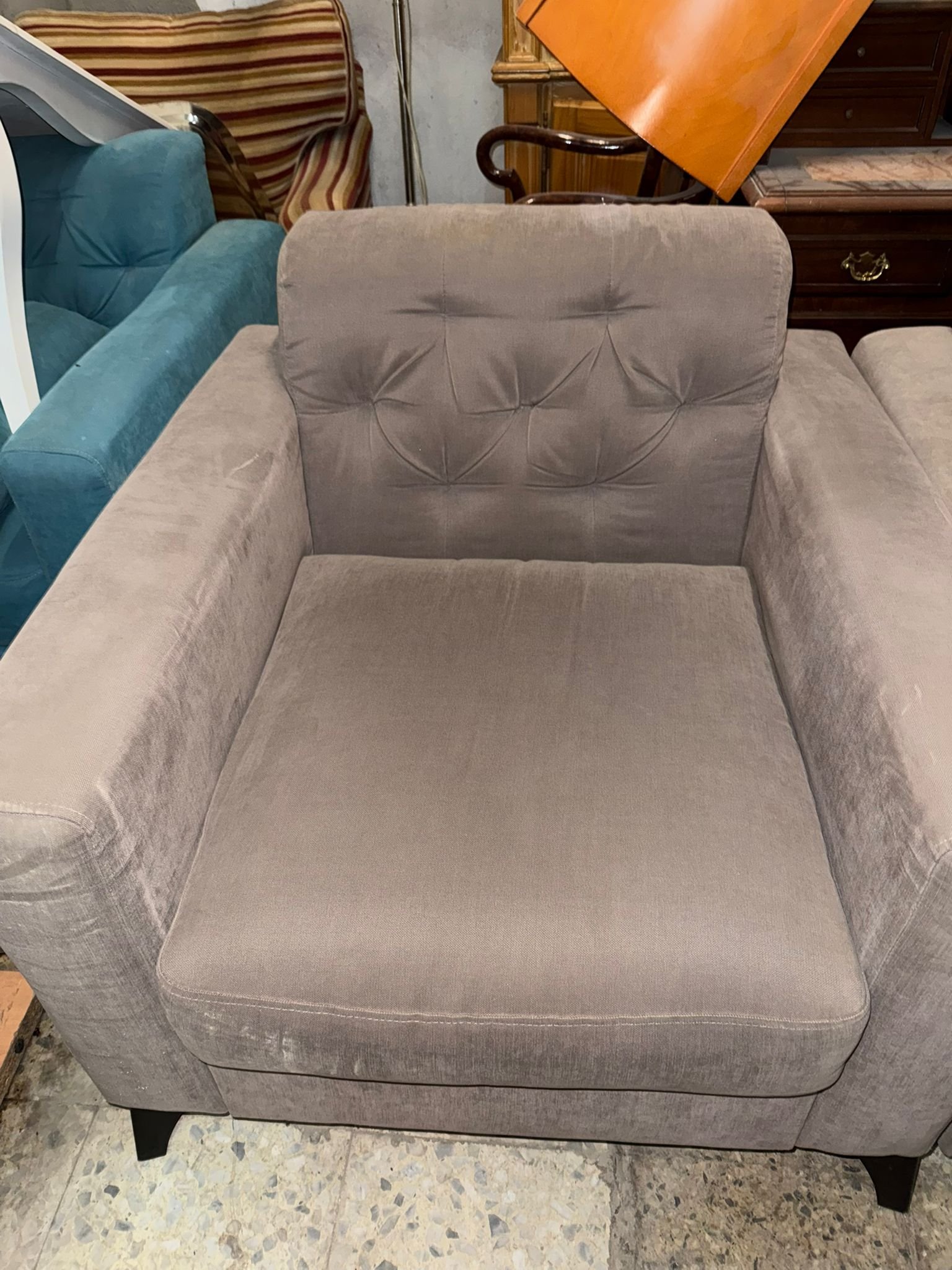 Sillón tipo butacón tapizado en tejido gris, con respaldo y asiento acolchados que aportan comodidad y un diseño equilibrado. Sus líneas rectas y proporciones compactas facilitan su integración.