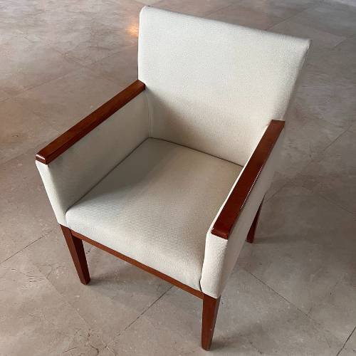 Silla tapizada con brazos de madera, diseño sencillo y elegante, ideal para comedor, oficina o sala de espera.