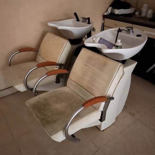 Módulo doble de lavacabezas para peluquería, con sillones tapizados en polipiel clara, apoyabrazos metálicos con detalles en madera y lavabos de cerámica con grifería incorporada.