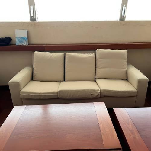 Sofá de 3 plazas en color beige, tapizado en tela, cómodo y de diseño moderno. Cojines de respaldo desenfundables para facilitar la limpieza.