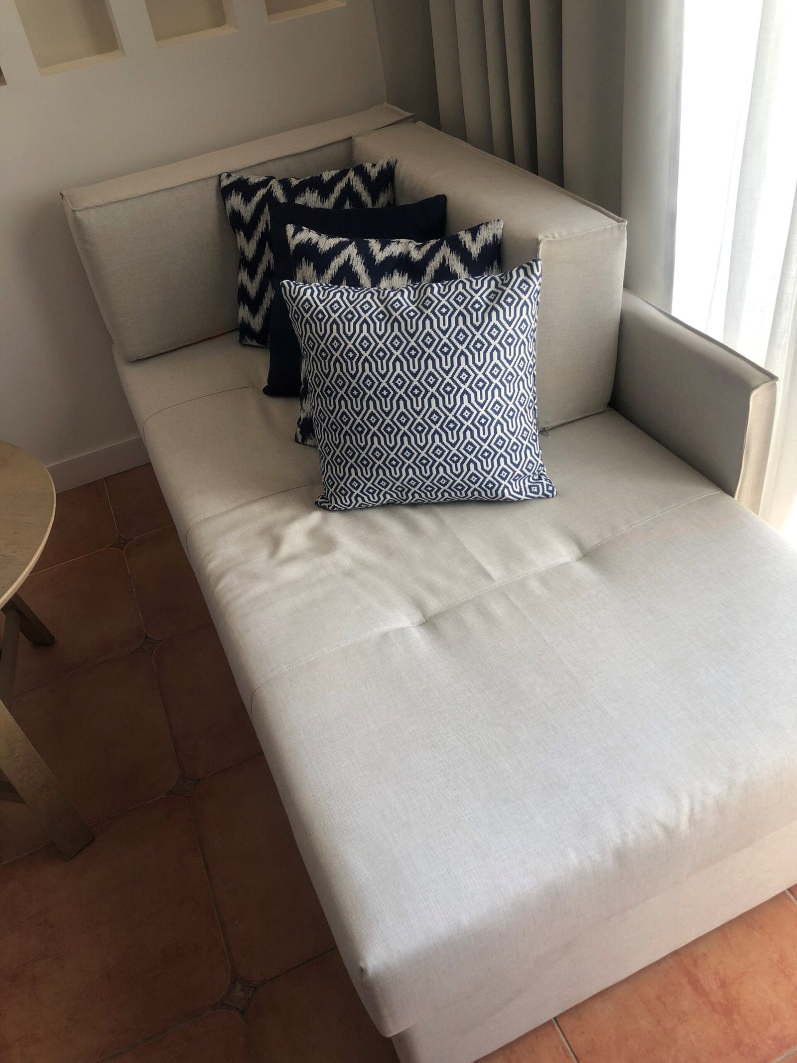 Sofá tipo chaise lounge en tono beige, en excelente estado, casi sin uso. Diseño moderno, asiento amplio y estructura robusta, ideal para renovar habitaciones o zonas de descanso con una opción sostenible y de alta calidad.